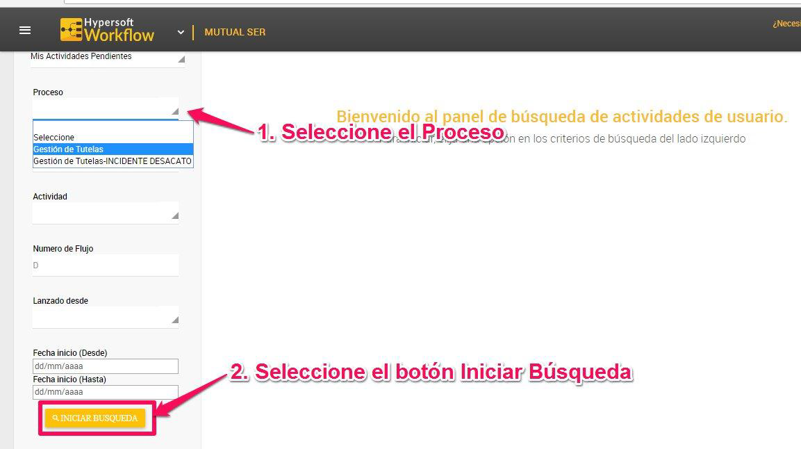 Paso 4. Seleccione el Proceso que desee para buscar las Actividades Pendientes del mismo y luego el botón Iniciar Búsqueda.