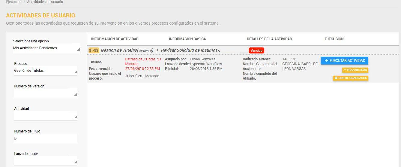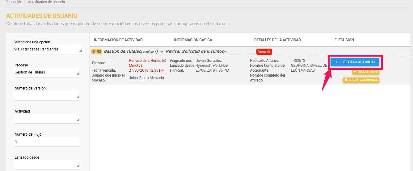 Paso 5. De esta manera aparecerán las actividades que tenga pendiente por realizar del proceso filtrado. Si desea que el sistema le muestre la información de todas las actividades pendientes de todos los procesos, no seleccione información del proceso, solo de clic en el botón iniciar búsqueda. Paso 6. Para realizar la actividad, de clic sobre el botón “Ejecutar Actividad”