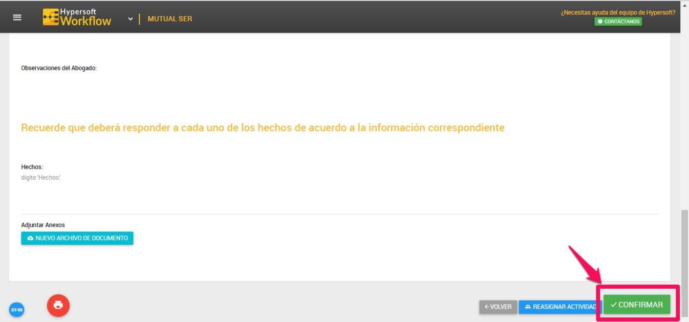 Paso 7. De esta manera aparecerá el formulario correspondiente a la actividad. Diligenciar dicho formulario con la información solicitada: hechos y/o puede adjuntar archivos en la opción de carga de archivo y para terminar seleccionar el botón “CONFIRMAR”.