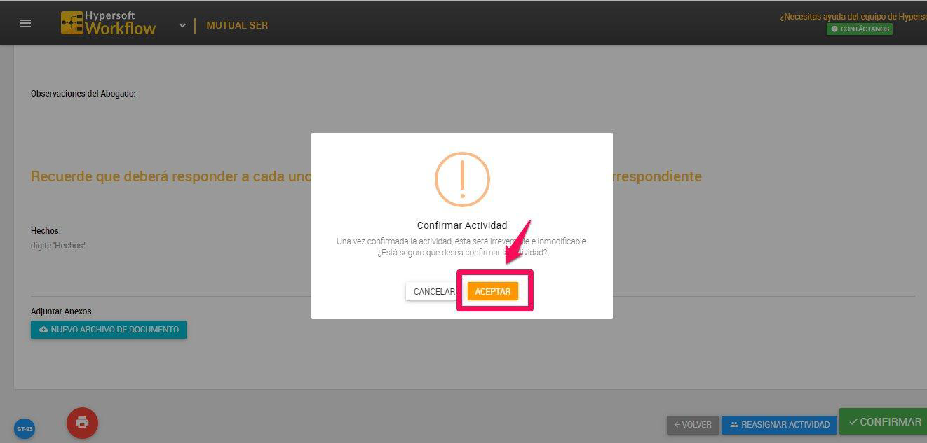 De este modo se estará confirmando la actividad realizada para que el flujo siga su curso y pase a una siguiente etapa.